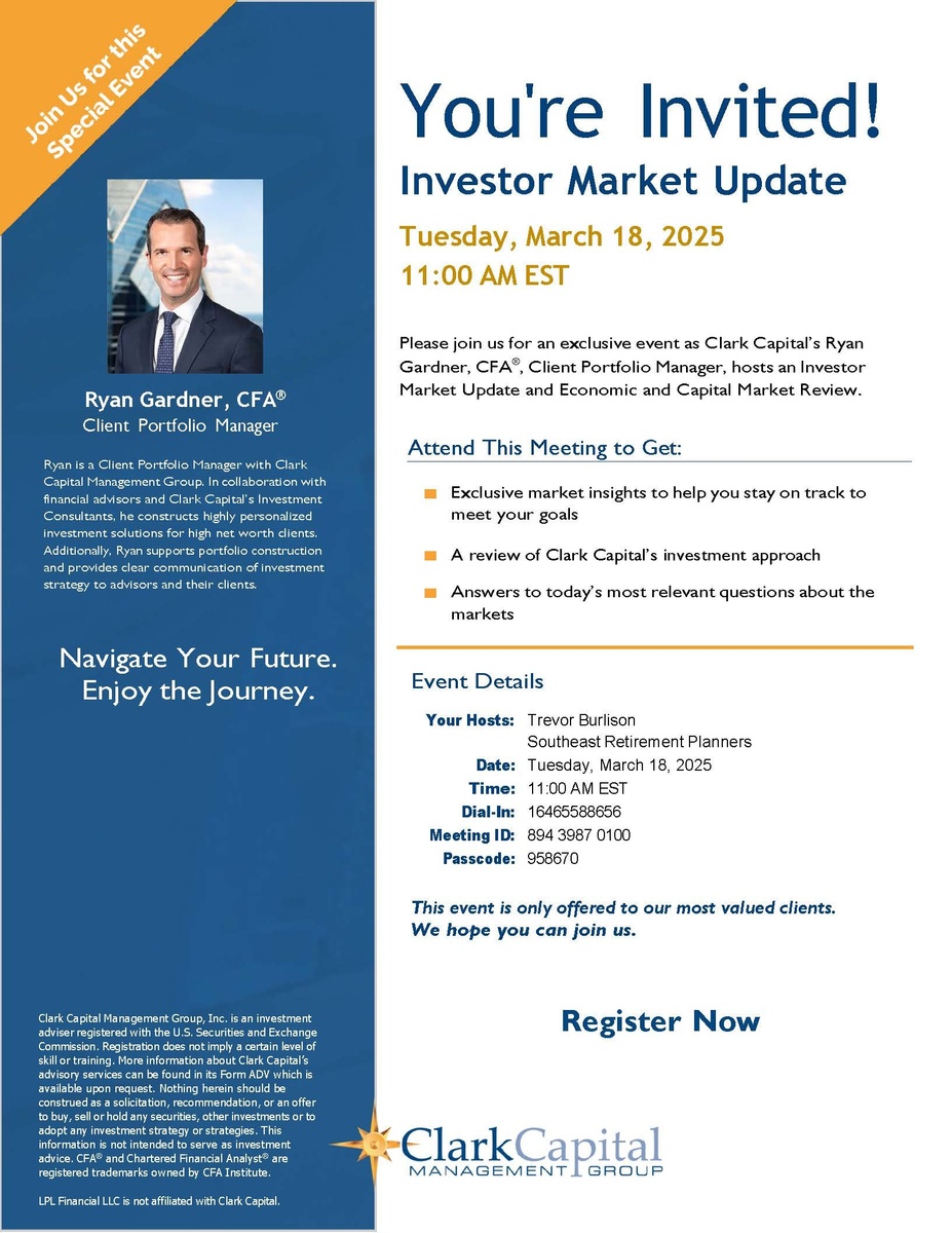 We're excited to invite you to an exclusive client webcast hosted by Clark Capital Management Group. Ryan Gardner, Client Portfolio Manager, will present an Investor Market Update on Tuesday, March 18th at 11:00am Eastern.